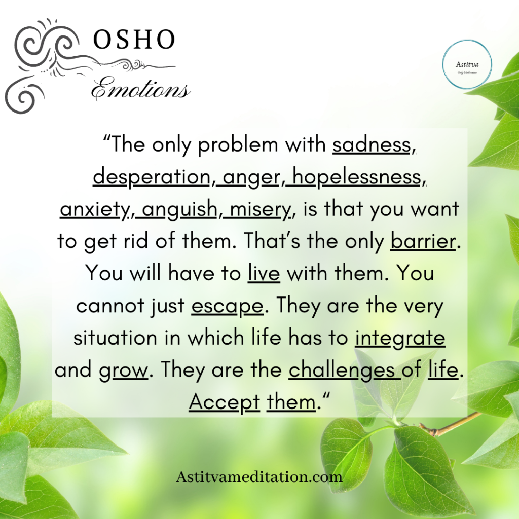 The only problem with sadness, desperation, anger, hopelessness, anxiety, anguish, misery, is that you want to get rid of them. That’s the only barrier. You will have to live with them. You cannot just escape. They are the very situation in which life has to integrate and grow. They are the challenges of life. Accept them.