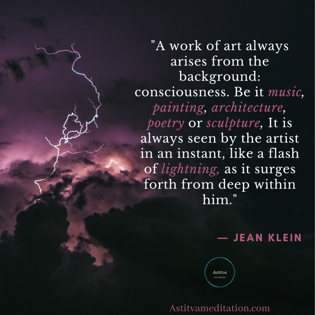 "A work of art always arises from the background: Consciousness. Be it music, painting, architecture, poetry or sculpture, It is always seen by the artist in an instant, like a flash of lightening, as it surges forth from deep within him."