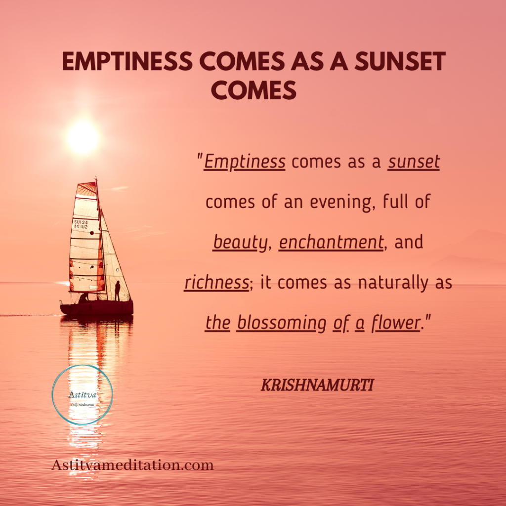 Emptiness comes as a sunset ~ KrishnamurtiKapil PiparaiyaNov 26, 20201 min readEmptiness comes as a sunset comes of an evening, full of beauty, enchantment, and richness; it comes as naturally as the blossoming of a flower. — Krishnamurti
