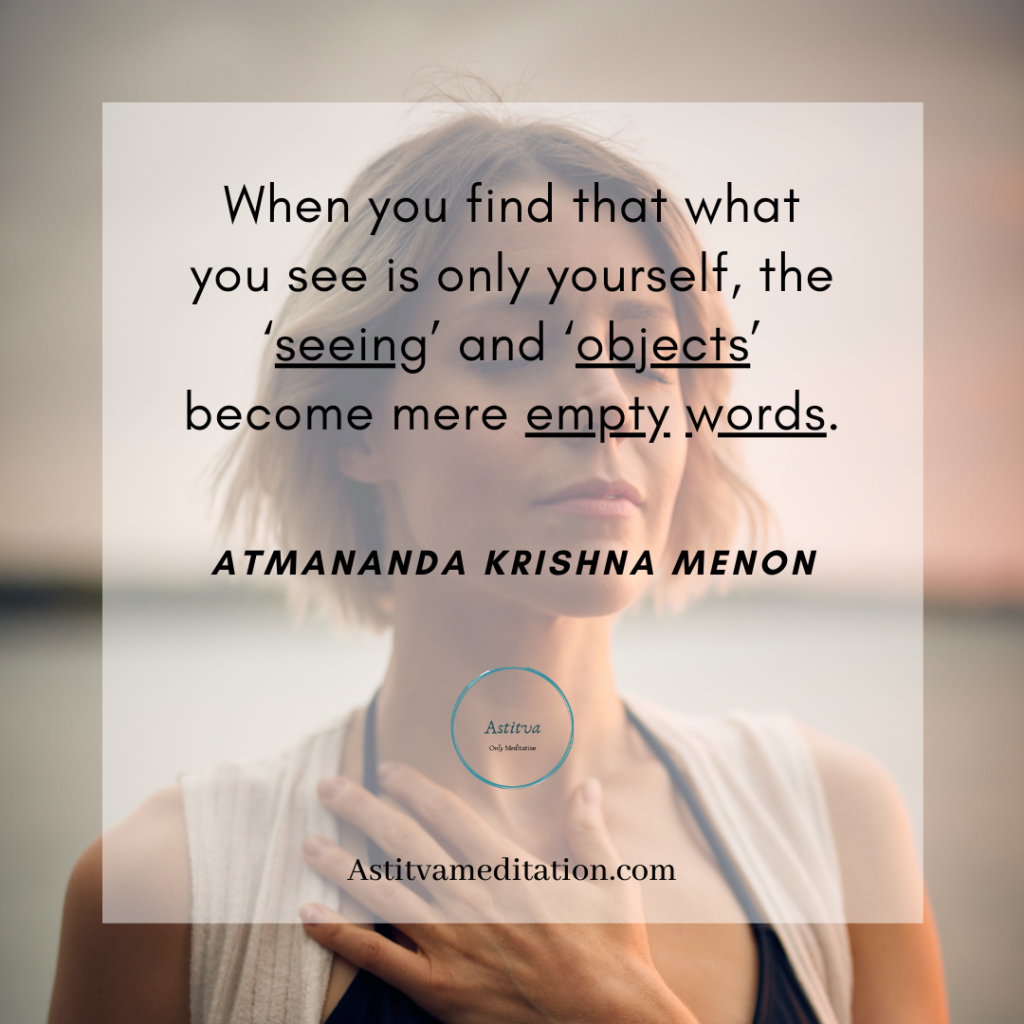 Empty words ~ Atmananda krishna menonKapil PiparaiyaDec 1, 20201 min readWhen you find that what you see is only yourself, the ‘seeing’ and ‘objects’ become mere empty words.Atmananda krishna menon