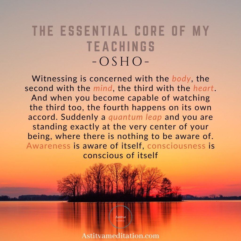 Witnessing is concerned with the body, the second with the mind, the third with the heart. And when you become capable of watching the third too, the fourth happens on its own accord. Suddenly a quantum leap and you are standing exactly at the very center of your being, where there is nothing to be aware of. Awareness is aware of itself, Consciousness is conscious of itself.