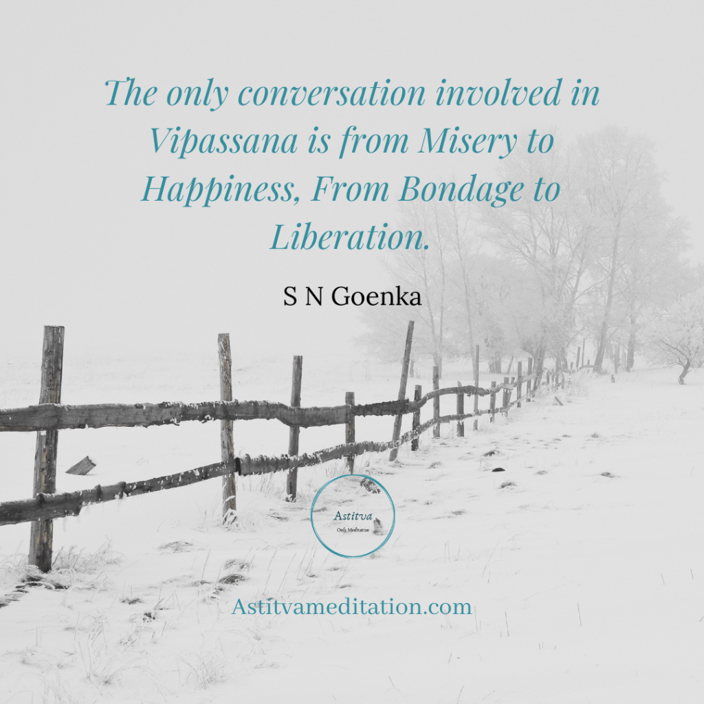 From Bondage to Liberation ~ S.N. GoenkaKapil PiparaiyaOct 26, 20201 min readThe only conversation involved in Vipassana is from Misery to Happiness, From Bondage to Liberation. - S.N. Goenka