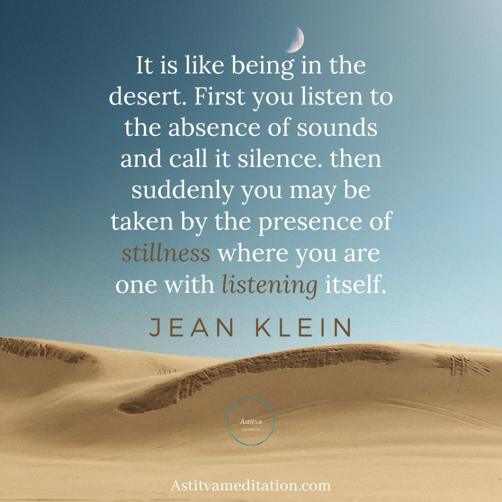 It is like being in the desert. First, you have to listen to the absence of the sound and call it silence. then suddenly you may be taken by the presence of stillness where you are one with listening to itself.