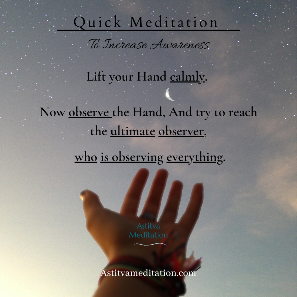 Quick Meditation ~ ObserveKapil PiparaiyaJan 28, 20211 min readLift your Hand calmly. Now observe the Hand. And try to reach the ultimate observer who is observing everything.