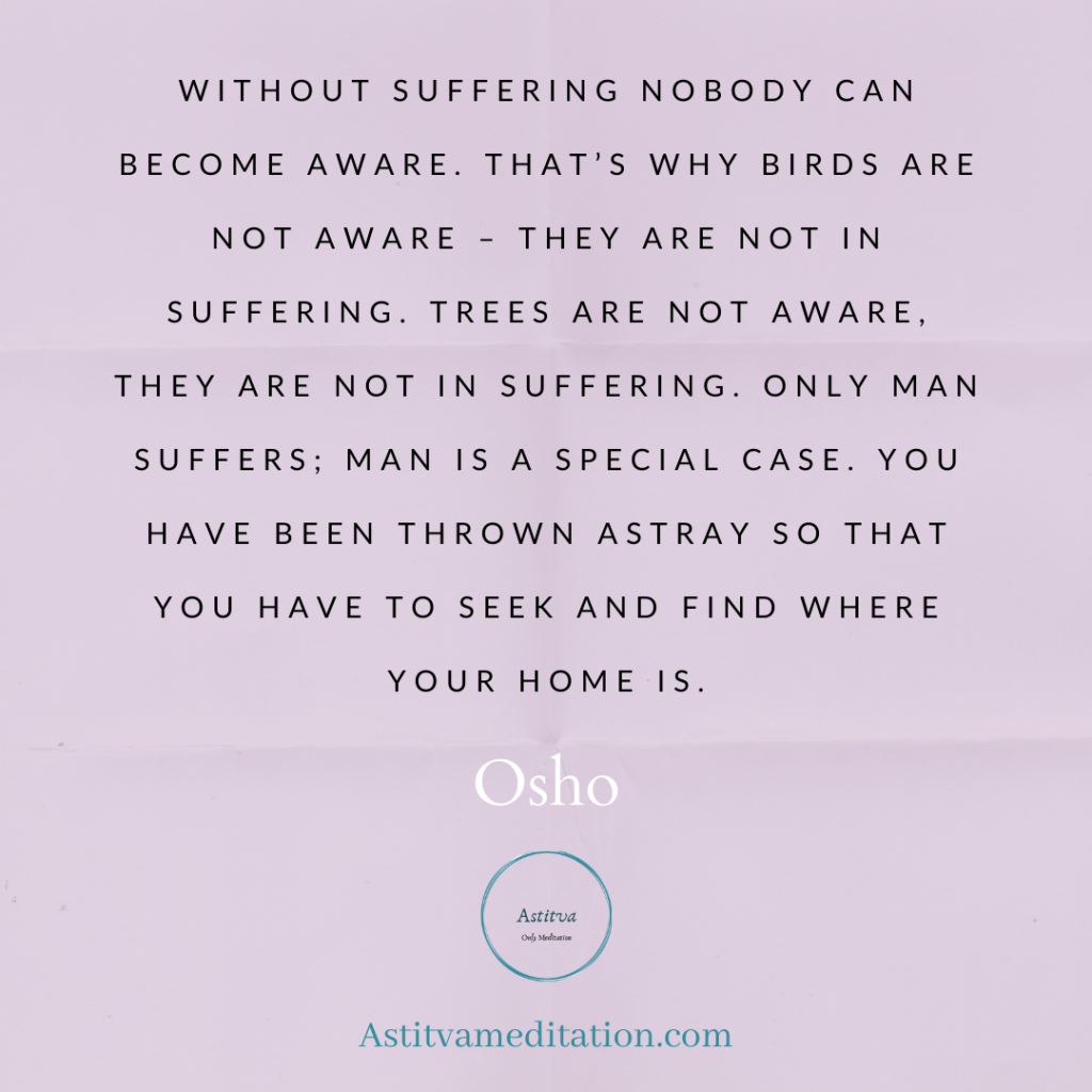 Without suffering nobody can become aware. That's why birds are not aware - They are not in suffering. Trees are not aware, They are not in suffering. Only man suffers: Man is a special case. You have been thrown astray so that you have to seek and find where your home is.