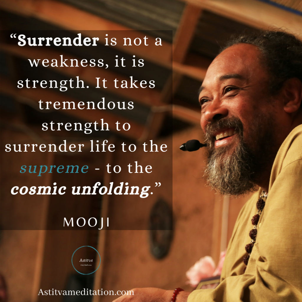 Surrender life to the supreme ~ MoojiKapil PiparaiyaNov 8, 20201 min read“Surrender is not a weakness, it is strength. It takes tremendous strength to surrender life to the supreme - to the cosmic unfolding.”― Mooji