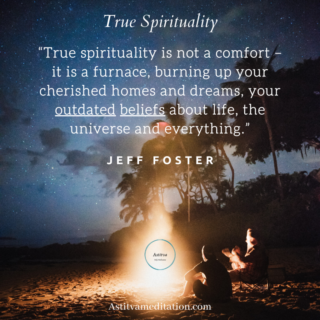 True Spirituality ~ Jeff FosterKapil PiparaiyaDec 7, 20201 min read“True spirituality is not a comfort – it is a furnace, burning up your cherished homes and dreams, your outdated beliefs about life, the universe and everything.” – Jeff Foster